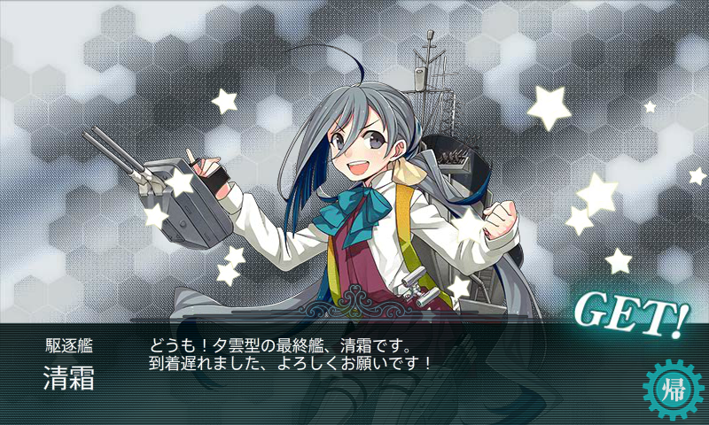 どうも!夕雲型の最終艦、清霜です。 到着遅れました、よろしくお願いです!